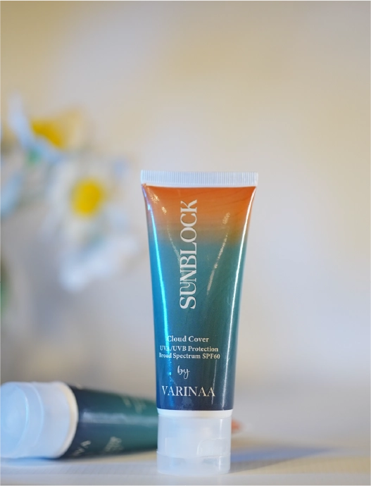 Varinaa organic Sunblock provides broad spectrum protection with SPF 60, safeguarding your skin from harmful UVA and UVB rays. Its lightweight, fast absorbing formula offers hydration without leaving a greasy finish or white cast. Water resistant & suitable for all skin types, including sensitive & acne prone skin, it effectively prevents premature aging while delivering a smooth, matte finish. Ideal for daily use, Varinaa Sunblock ensures optimal sun protection for your skin’s health & vitality.